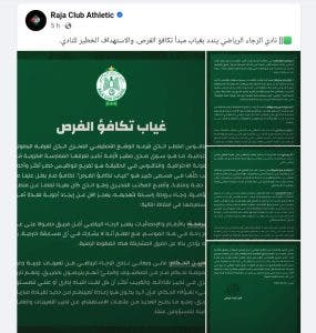وحسب بلاغ النادي الذي نشره على صفحته الرسمية عبر موقع التواصل الاجتماعي “فيسبوك” فقد أكد الرجاء على تعرضه للظلم بخصوص البرمجة وتعييات الحكام ومواعيد المقابلات وحرمانه من الجماهير المشجعة للنادي الأخضر.