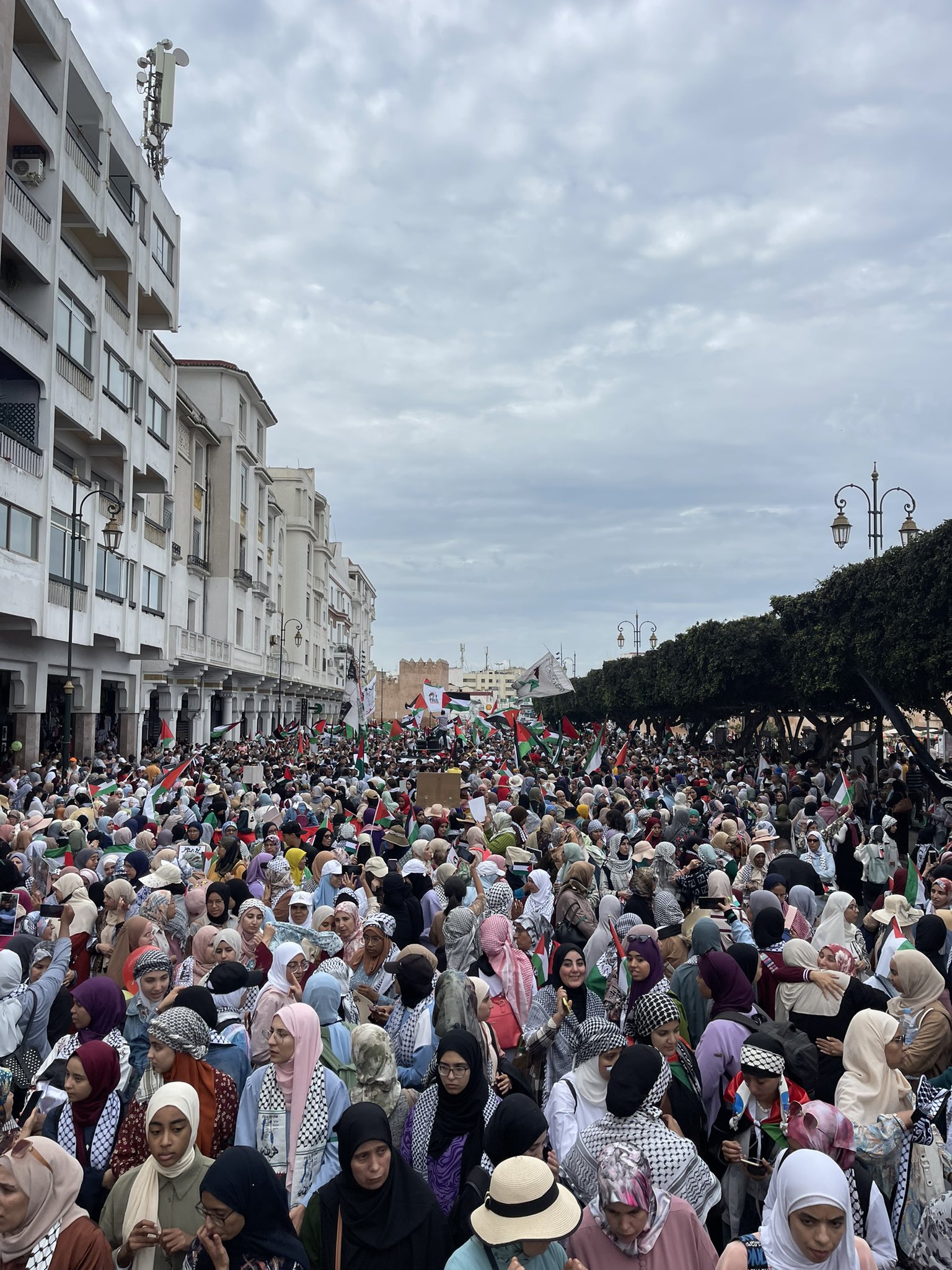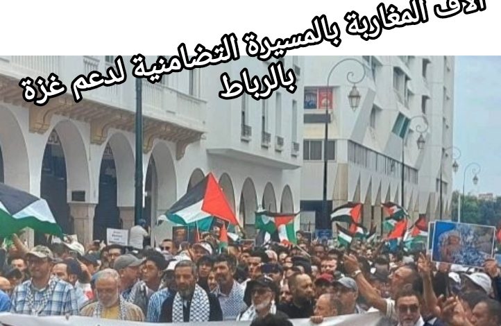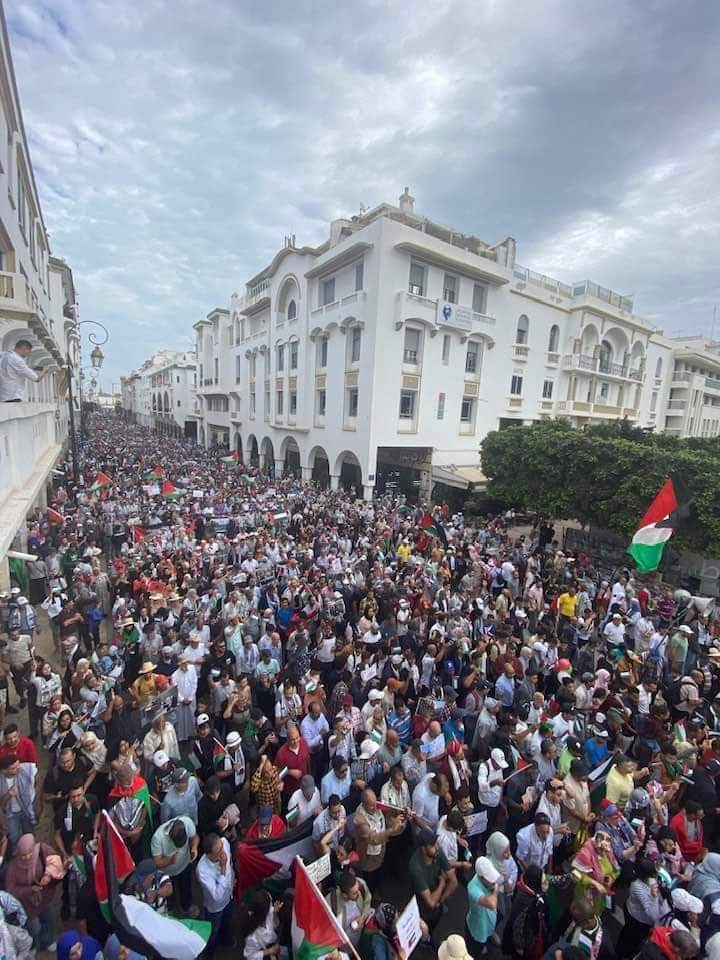 تلبية لنداء،الجبهة المغربية لدعم فلسطين ومناهضة التطبيع” و”مجموعة العمل الوطنية من أجل فلسطين” تحت شعار “الشعب المغربي مع طوفان الأقصى.. ضد التطبيع” خرج آلاف المغاربة بالمسيرة التضامنية لدعم غزة ،انطلقوا من ساحة باب الأحد بشارع الحسن الثاني إلى مقر البرلمان على مستوى شارع محمد الخامس بالرباط.