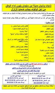 على إثر مخلفات الزلزال الذي ضرب المغرب يوم الجمعة 8 شتنبر 2023 وخلّف عدة خسائر بشرية ومادية في العديد من المناطق، خاصة إقليمي الحوز وتارودانت وهو مايدعونا جميعا كساكنة إقليم بنسليمان في المجهود الوطني للتخفيف من آثار هذا المصاب الجلل.