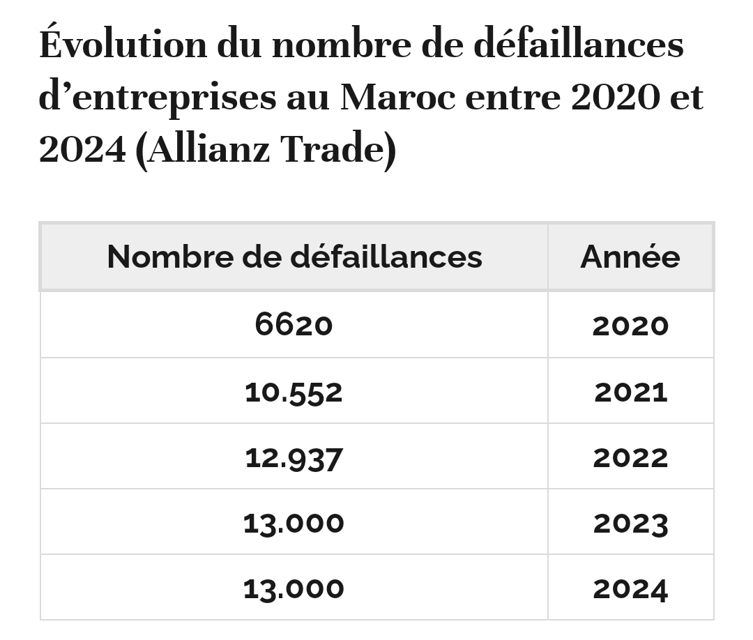 وفي النسخة الأخيرة من “مؤشر الإعسار العالمي” ، توقعت شركة أليانز تريد ، التابعة لشركة التأمين الألمانية ، إفلاس حوالي 13 ألف شركة في المغرب في عام 2023 ، بسبب الوضع الاقتصادي العالمي. وهو رقم ، إذا تحقق ، سيكون رقماً قياسياً جديداً لإخفاقات الأعمال في المغرب.
