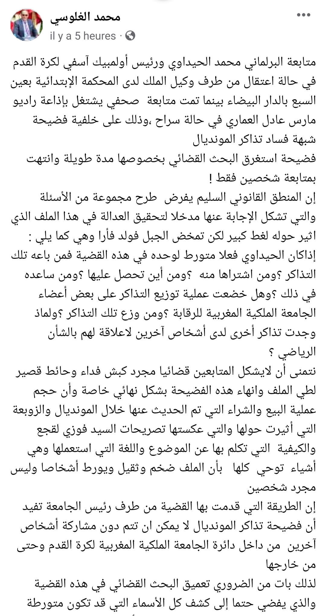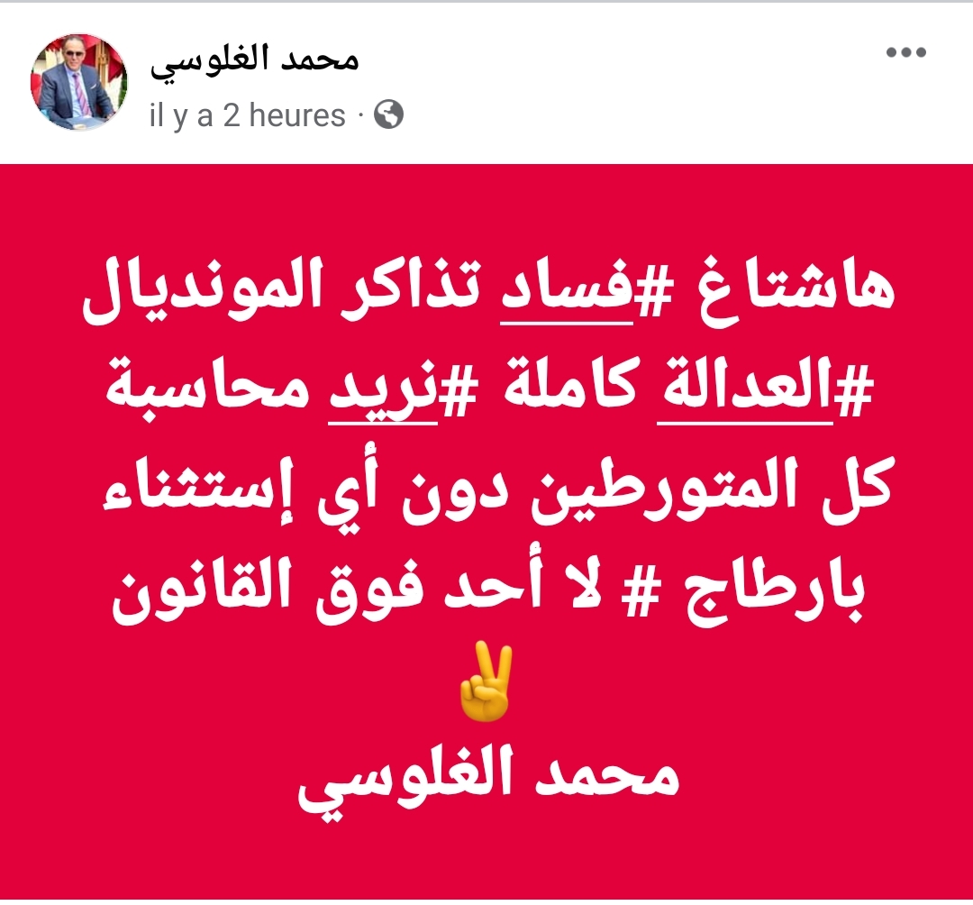 إن الطريقة التي قدمت بها القضية من طرف رئيس الجامعة تفيد أن فضيحة تذاكر المونديال لا يمكن ان تتم دون مشاركة أشخاص آخرين من داخل دائرة الجامعة الملكية المغربية لكرة القدم وحتى من خارجها