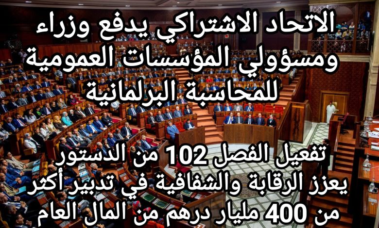 في خطوة رقابية جريئة، جَرَّ فريق الاتحاد الاشتراكي للقوات الشعبية ـ المعارضة الاتحادية في مجلس النواب المغربي ـ وزراء الحكومة وكبار المسؤولين عن المؤسسات العمومية التي تدير ميزانيات تفوق 400 مليار درهم، إلى جلسات المحاسبة أمام اللجان البرلمانية الدائمة. وتأتي هذه المبادرة استناداً إلى الفصل 102 من الدستور المغربي، الذي يخول للجان البرلمانية الدائمة صلاحية استدعاء أعضاء الحكومة ومسؤولي المؤسسات العمومية لتقديم حساباتهم حول أدائهم ومدى نجاعة تدبيرهم للمال العام.
