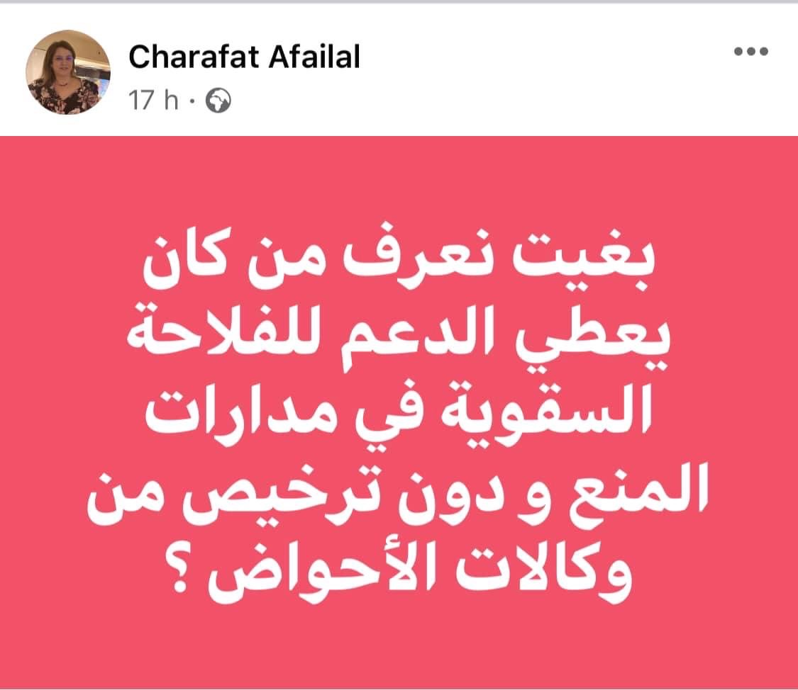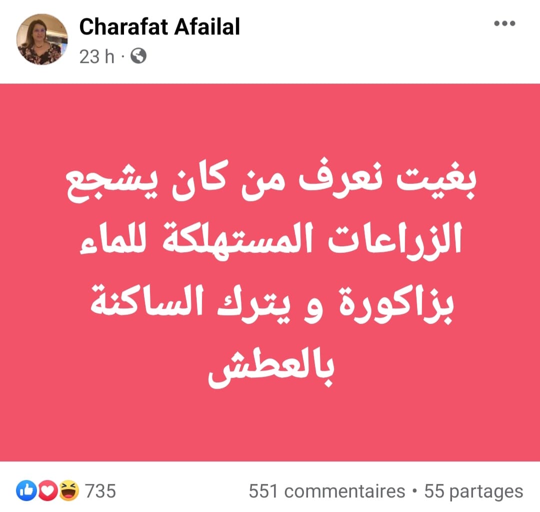 و اتمنى خالصا ان تفرق ما بين اكراه الماء الصالح للشرب و الماء الذي نحتاجه للسقي قصد ضمان انتاج فلاحي يحمي بلادنا في عالم لا يتكلم الا على السيادة الغدائية