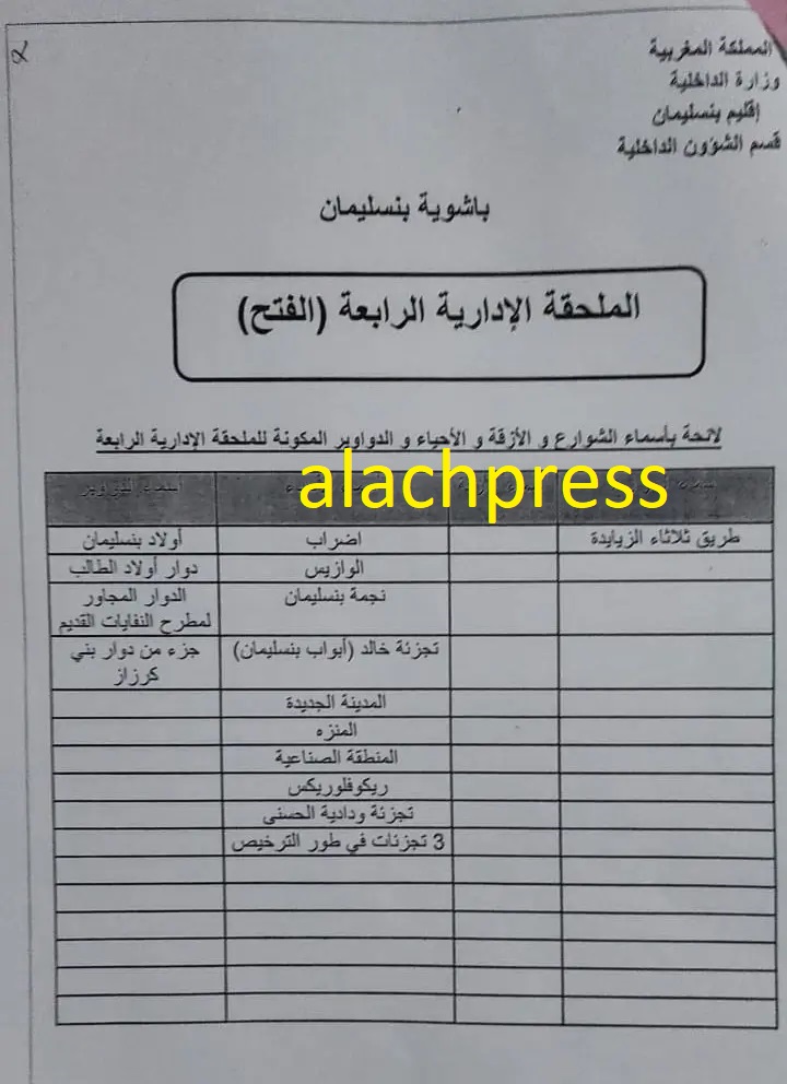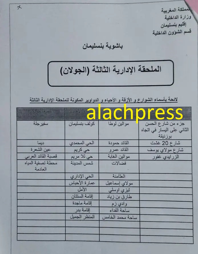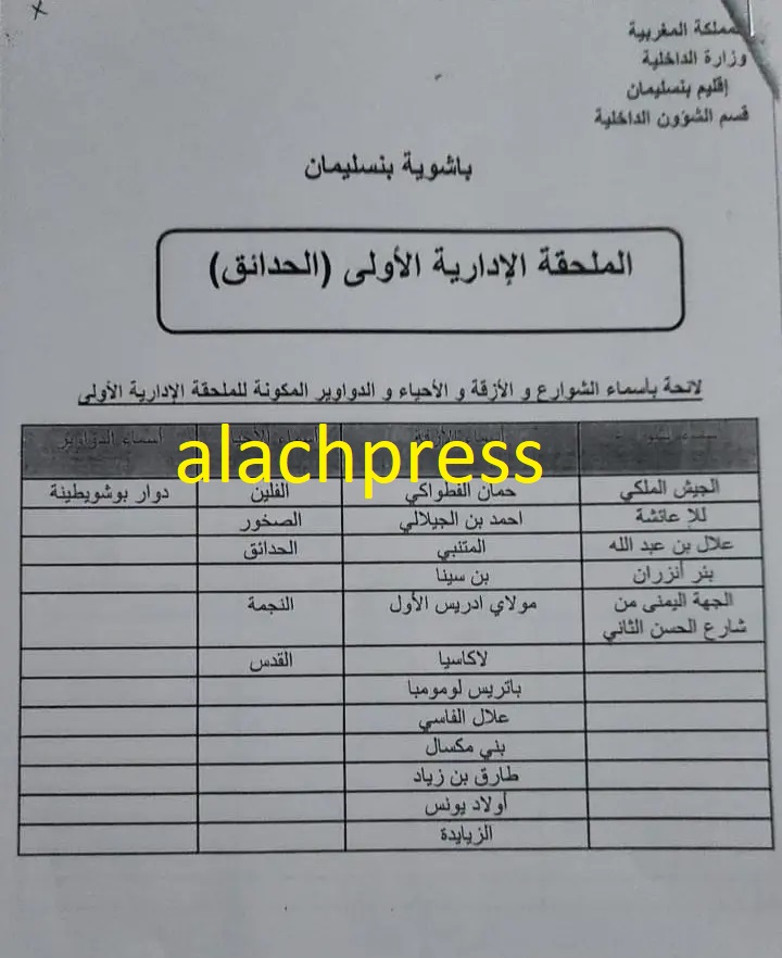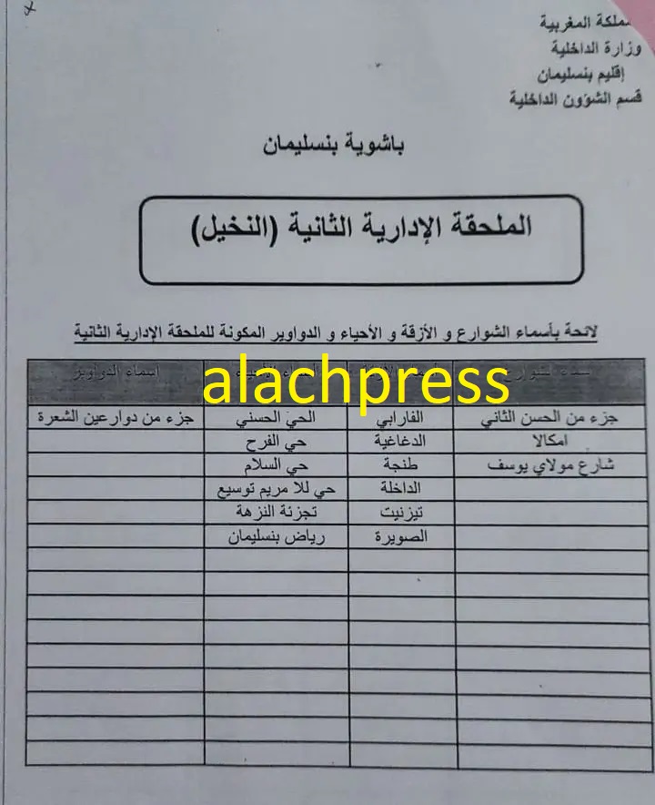 التقسيم الاداري الجديد للملحقات الادارية بمدينة بنسليمان