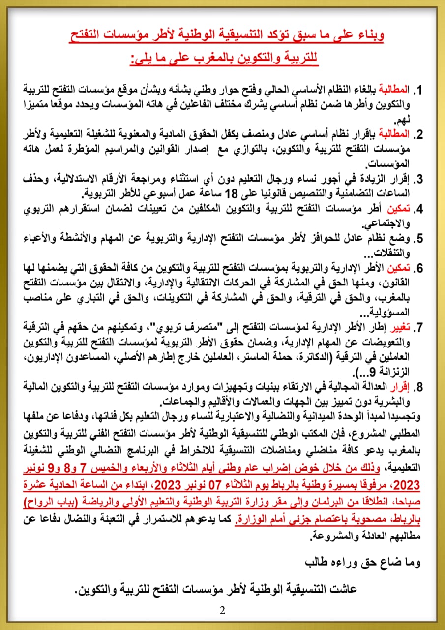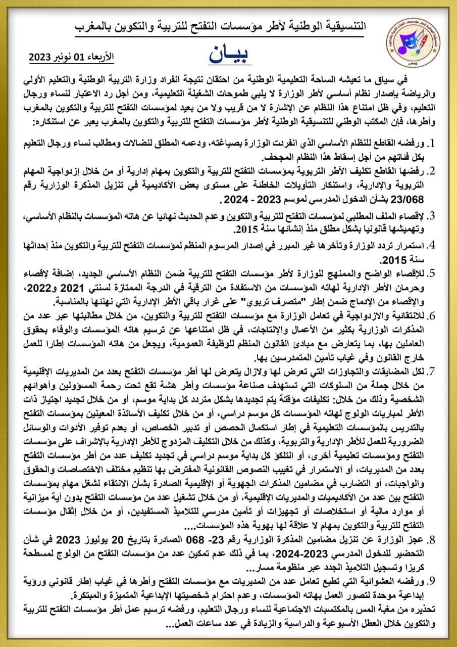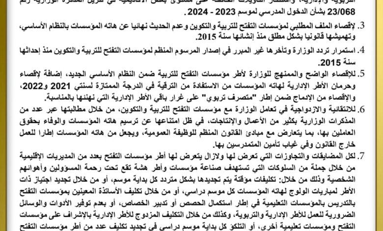 الرئيسية/أخبار/التنسيقية الوطنية لأطر مؤسسات التفتح بالمغرب تصدر بيانا تنديديا لاقصائها في النظام الأساسي الجديد: أخبار التنسيقية الوطنية لأطر مؤسسات التفتح بالمغرب تصدر بيانا تنديديا لاقصائها في النظام الأساسي الجديد: أبو جناالجمعة 3 نوفمبر 2023 أقل من دقيقة عمر ملوك أبو جناالجمعة 3 نوفمبر 2023 أقل من دقيقة اظهر المزيد فيسبوك تويتر واتساب تيلقرام مشاركة عبر البريد طباعة