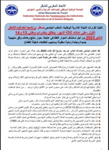 الرئيسية/الجامعة الوطنية لموظفي الجماعات الترابية والتدبير المفوض (إ.م.ش) تسطر برنامجا نضاليا ينطلق بإضراب وطني يومي 13 و14 شتنبر الجاري وتنظم ندوة صحفية لتسليط الاضواء على اوضاع العاملات والعاملين بالقطاع/FB_IMG_1693859318778 FB_IMG_1693859318778