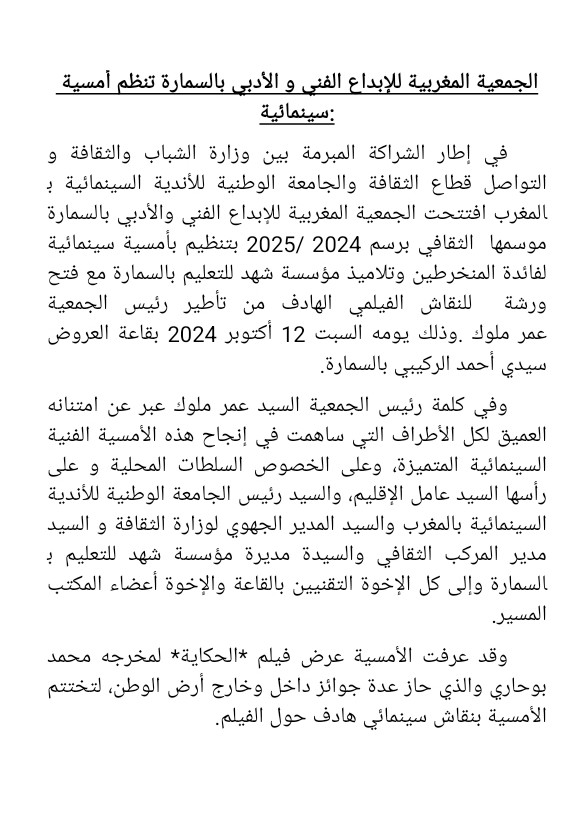 الرئيسية/أخبار/الجمعية المغربية للإبداع الفني و الأدبي بالسمارة تنظم أمسية سينمائية. أخبار الجمعية المغربية للإبداع الفني و الأدبي بالسمارة تنظم أمسية سينمائية. أبو جناالثلاثاء 15 أكتوبر 2024 أقل من دقيقة علاش بريس أبو جناالثلاثاء 15 أكتوبر 2024 أقل من دقيقة اظهر المزيد فيسبوك تويتر واتساب تيلقرام مشاركة عبر البريد طباعة