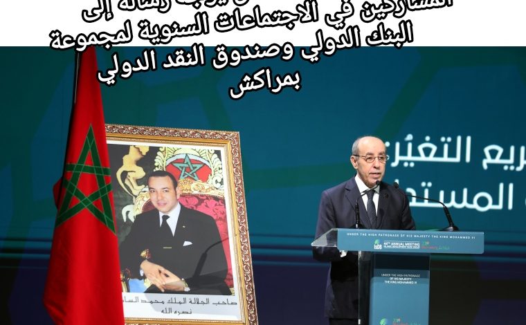 بعث صاحب الجلالة الملك محمد السادس، اليوم الجمعة، رسالة إلى المشاركين في الاجتماعات السنوية لمجموعة البنك الدولي وصندوق النقد الدولي، المنعقدة من 9 إلى 15 أكتوبر بمراكش.