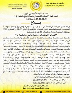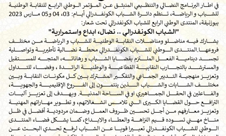 في اطار البرنامج النضالي والتنظيمي المنبثق عن المؤتمر الوطني الرابع للنقابة الوطنية للشباب و الرياضة، تنظم دائرة الشباب الكونفدرالي أيام: 03، 04 و05 مارس 2023 ببوزنيقة، المنتدى الوطني الرابع للشباب الكونفدرالي تحت شعار: