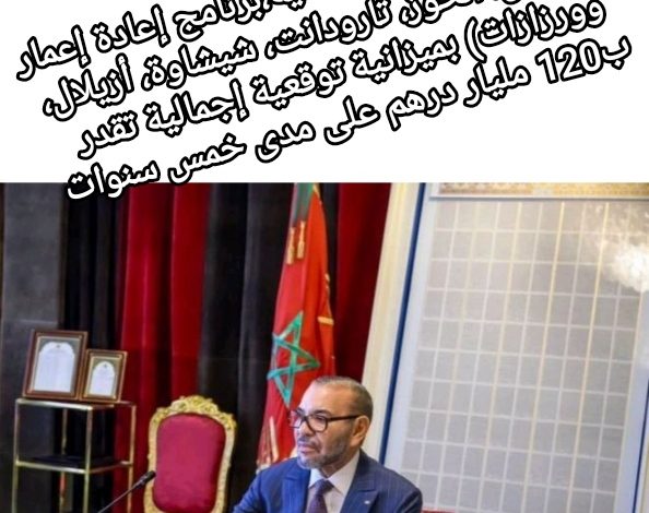 امتدادا للتوجيهات الملكية،برنامج إعادة إعمار (مراكش، الحوز، تارودانت، شيشاوة، أزيلال، وورزازات) بميزانية توقعية إجمالية تقدر ب120 مليار درهم على مدى خمس سنوات