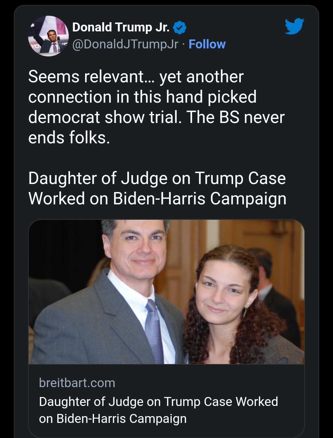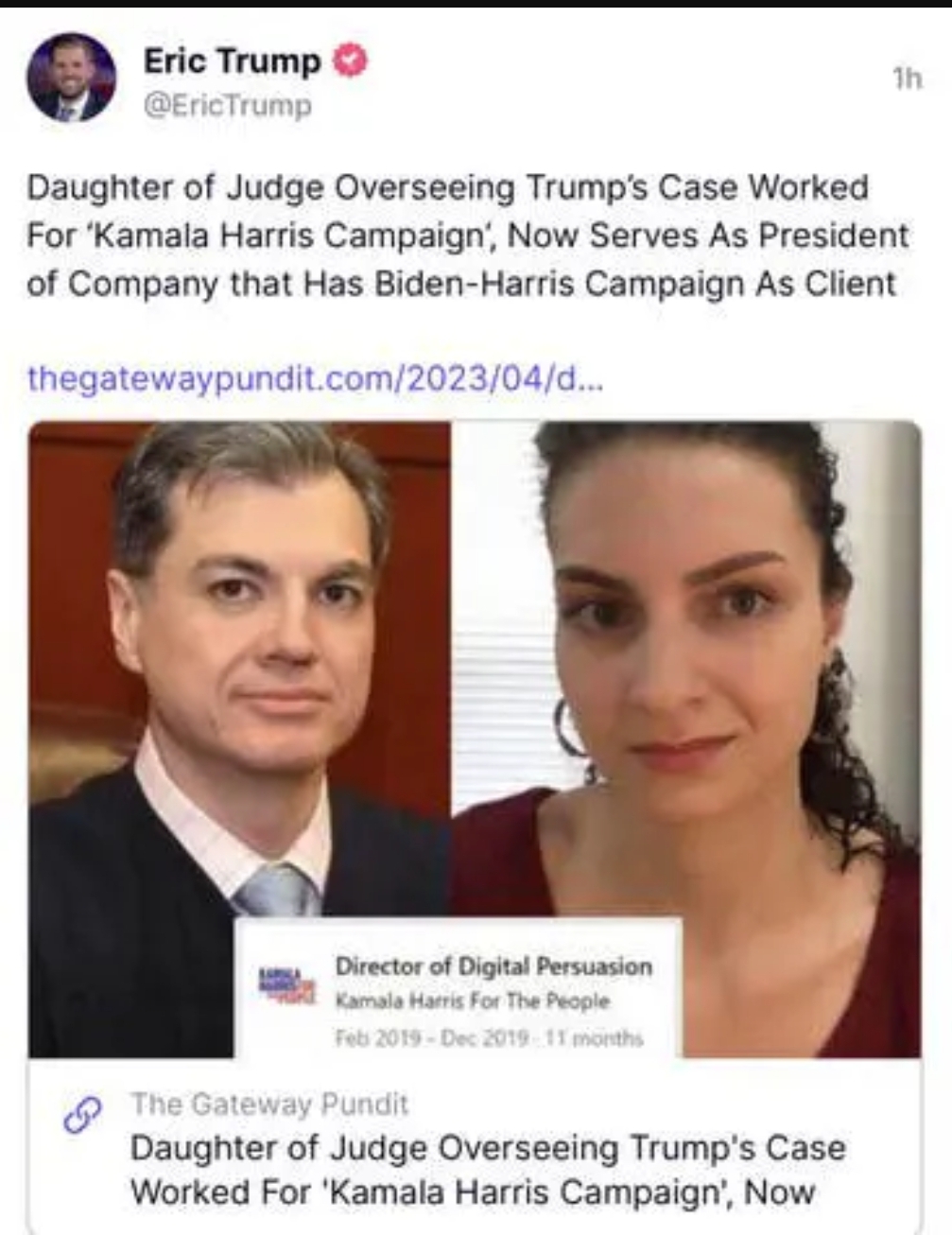 ومن جهة دونالد الابن الآخر ،فنشر تغريدة على حسابه بتويتر، مساء أمس، شارك بها تقريراً صحفيا يشير إلى أن لورين، ابنة القاضي الناظر في قضية والده خوان مارشان. ، عملت ضمن الحملة الرئاسية لنائبة الرئيس الأميركي الحالي كامالا هاريس عام 2020.