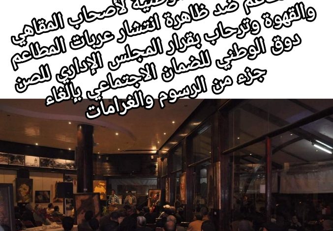 انتفاضة الجامعة الوطنية لأصحاب المقاهي والمطاعم ضد ظاهرة انتشار عربات المطاعم والقهوة وترحاب بقرار المجلس الإداري بإلغاء جزء من الرسوم والغرامات