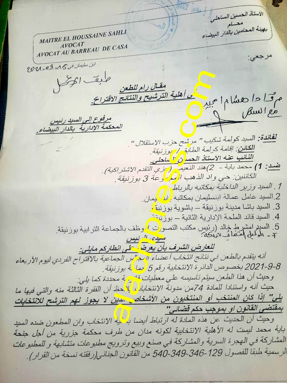 أقدم شكيب كولمة مرشح حزب الاستقلال بالدائرة 05 ببوزنيقة، على الطعن أمام القضاء ضد وكيل لائحة حزب التقدم والاشتراكية (رمز الكتاب) في الدائرة السالفة الذكر.