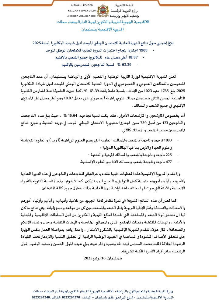 بلاغ إخباري حول نتائج الباكالوريا بالمديرية الإقليمية للتعليم بإقليم ببنسليمان