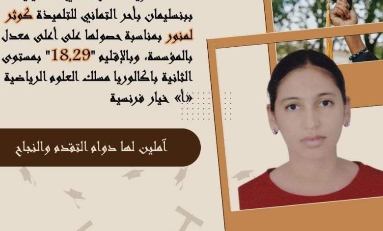 تمكنت التلميذة كوثر لمنور، من الثانوية التاهيلية الحسن الثاني ببنسليمان اقليم بنسليمان، من الحصول على أعلى معدل في امتحانات نيل شهادة البكالوريا برسم السنة الدراسية الحالية على مستوى إقليم بنسليمان .