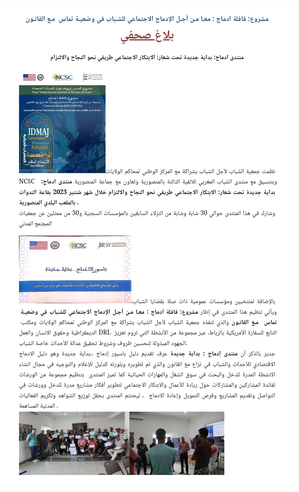 الرئيسية/أخبار/جمعية شباب لأجل الشباب تنظم قافلة إدماج بشراكة مع المركز الوطني لمحاكم الولايات و بتنسيق مع منتدى الشباب المغربي للألفية الثالثة بالمنصورية أخبار جمعية شباب لأجل الشباب تنظم قافلة إدماج بشراكة مع المركز الوطني لمحاكم الولايات و بتنسيق مع منتدى الشباب المغربي للألفية الثالثة بالمنصورية أبو جناالجمعة 3 نوفمبر 2023 أقل من دقيقة علاش بريس أبو جناالجمعة 3 نوفمبر 2023 أقل من دقيقة اظهر المزيد فيسبوك تويتر واتساب تيلقرام مشاركة عبر البريد طباعة