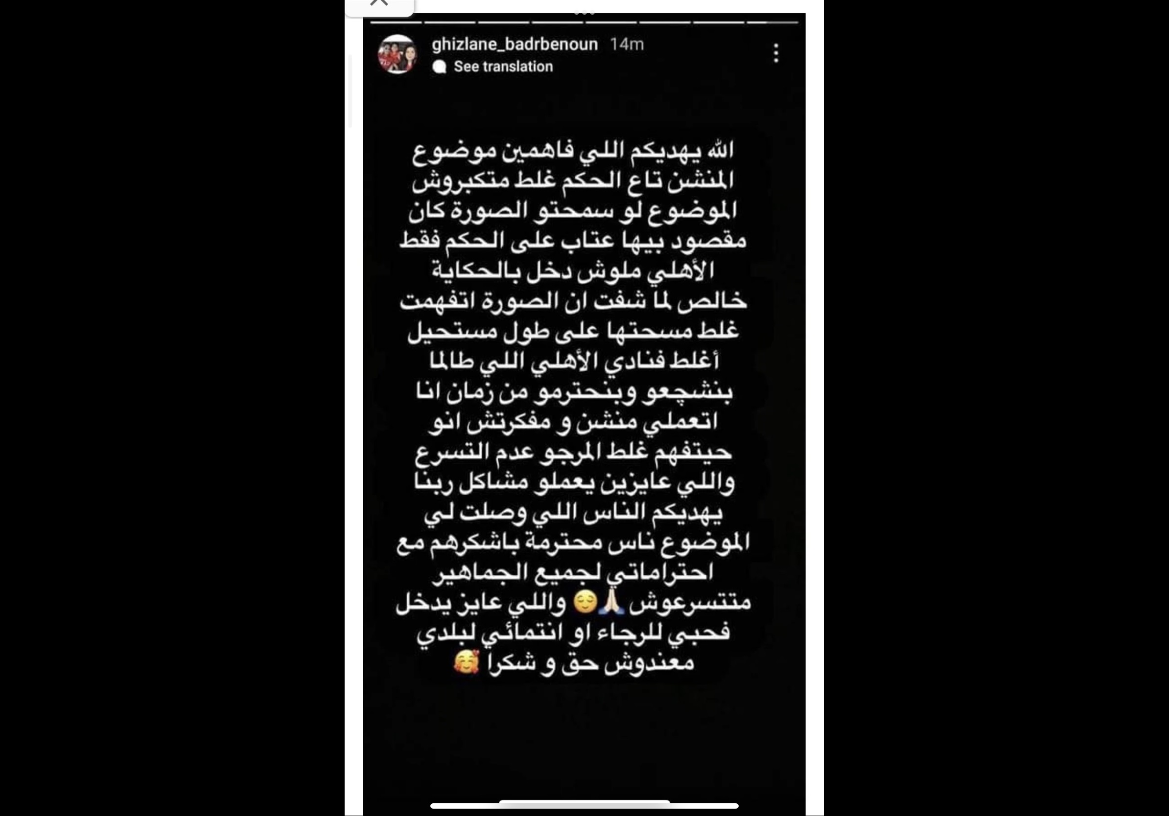 وعملت غزلان بعدها على حذف الستوري علي الفور وقامت باعتذار لجمهور الأهلي قائلة: «الله يهديكم اللي فاهمين موضوع المنشن بتاع الحكم غلط، متكبروش الموضوع لو سمحتوا، الصورة كان مقصود بيها عتاب على الحكم فقط “.