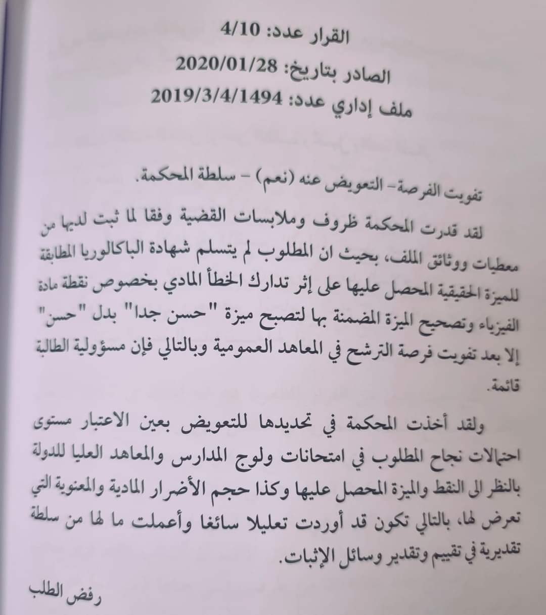 قام التلميذ من خلال محاميه الأستاذ عبداللطيف باي، المحامي بمراكش، برفع دعوى ضد الاكاديمية الجهوية للتربية و التكوين مراكش آسفي في شخص ممثلها القانوني، من أجل تعويضه عن تفويت الفرصة بما قدره 100 مليون سنتيم، فأجابت المدعى عليها بأن سبب التأخير يعود الى العطلة الصيفية لشهر غشت وانه خلال هذا الشهر تكون المؤسسات ايضا في عطلة، والتمست رفض الطلب، الا ان المحكمة الإدارية بمراكش قضت بقبول الدعوى والحكم على المدعى عليها بتعويض التلميذ بمبلغ 15 مليون سنتيم.