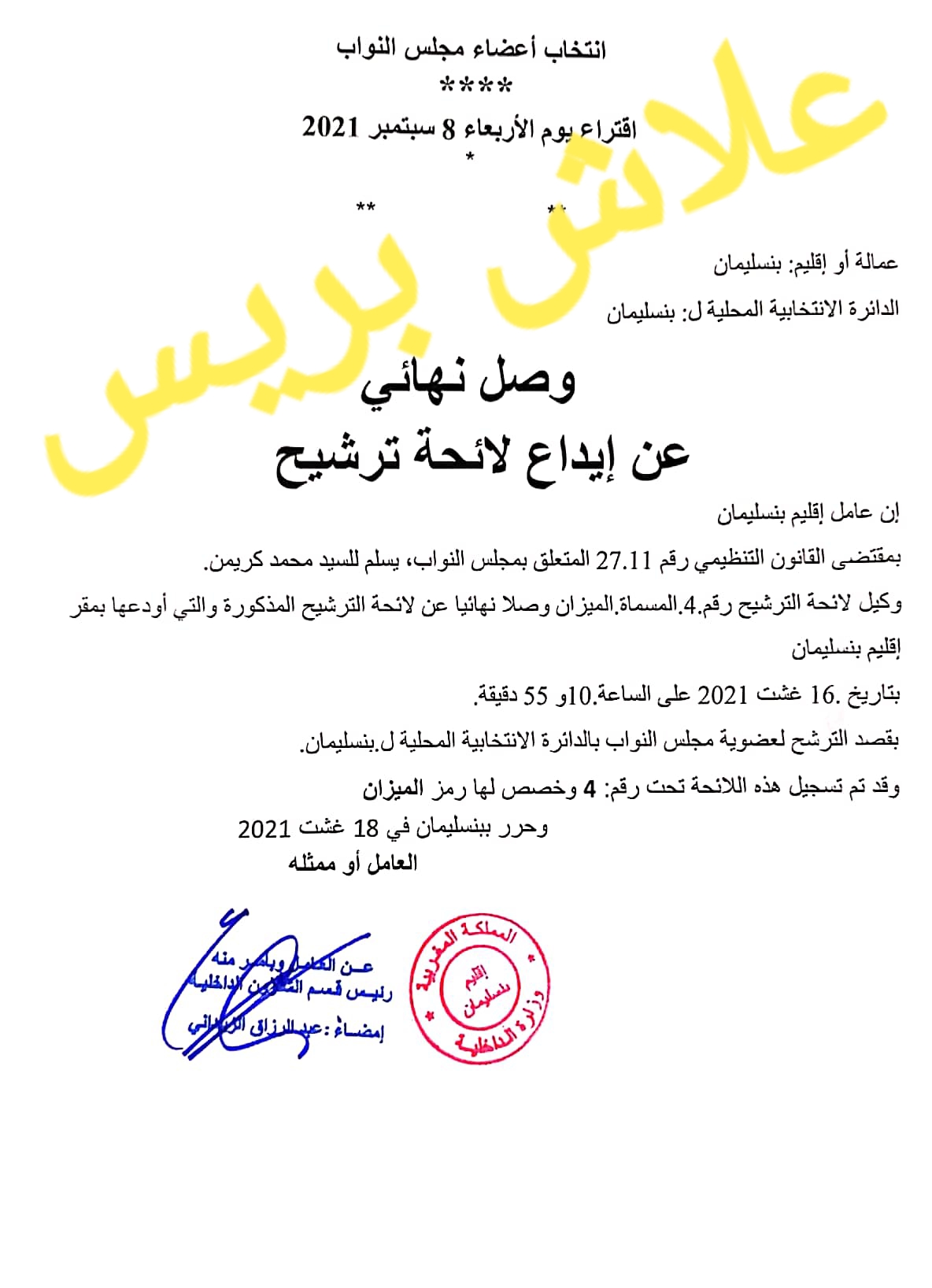 ومنحت عمالة بن سليمان صباح اليوم، الوصل النهائي عن ايداع لائحة الترشيح التي يترأسها محمد كريمين الى جانب احمد الدهي ومحمد اجديرة.