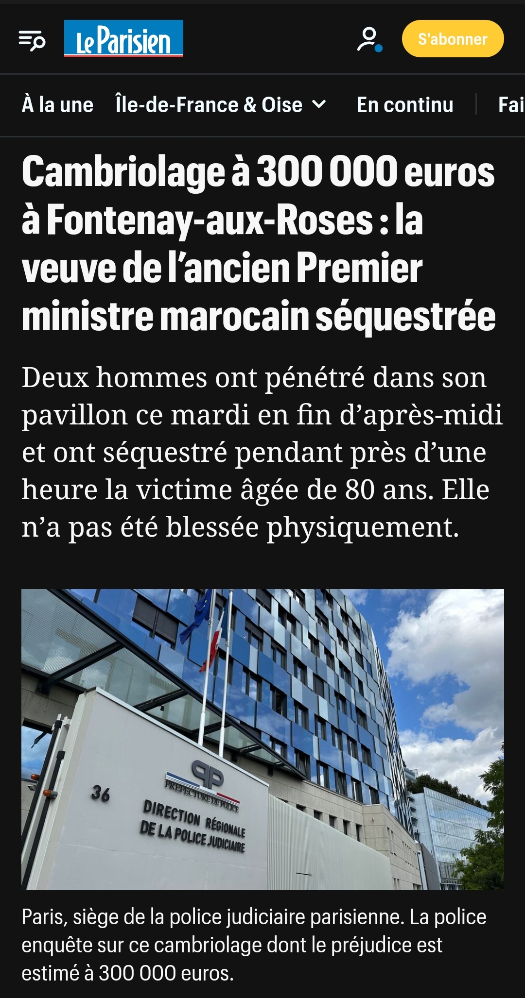 أفادت صحيفة “لو باريزيان اليومية الفرنسية، أن منزل أرملة رئيس الوزراء المغربي السابق عبد اللطيف الفيلالي، الواقع في فونتيناي أو روز، في منطقة أوت دو سين، تعرض لعملية سطو ظهر يوم الثلاثاء 10 أكتوبر الجاري. حينما دخل شخصان أثناء وجود الأرملة البالغة من العمر 80 عاما، وليحتجزوها لمدة ساعة تقريبا.