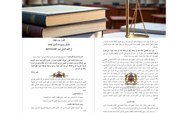 يمثل قرار محكمة النقض المغربية رقم 1386 الصادر بتاريخ 14 أكتوبر 2020 نقطة فارقة في تطور القانون المغربي فيما يتعلق بالخيانة الزوجية في العصر الرقمي، إذ قضى بأن الممارسة الجنسية الافتراضية عبر تطبيقات التواصل الاجتماعي مثل الواتساب بين شخص متزوج وآخر خارج إطار الزواج تُعد خيانة زوجية.