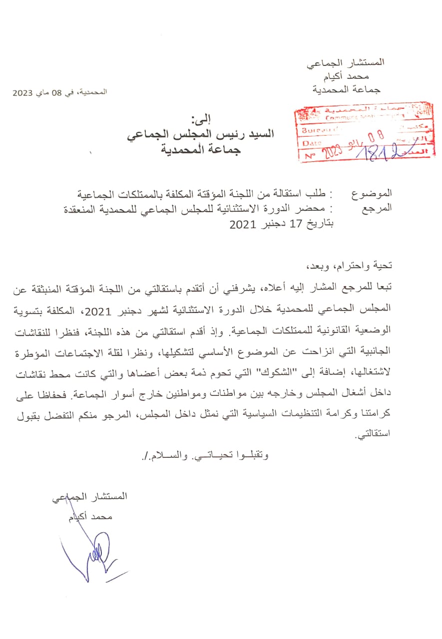 الموضوع : طلب استقالة من اللجنة المؤقتة المكلفة بالممتلكات الجماعية