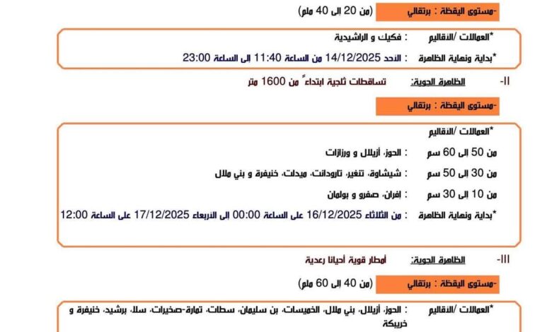 أصدرت المديرية العامة للأرصاد الجوية نشرة إنذارية من مستوى اليقظة البرتقالية، تحذر فيها من اضطرابات جوية قوية ستهم عدداً من أقاليم المملكة، من بينها إقليم بنسليمان، وذلك ابتداءً من يوم الأحد 14 دجنبر 2025 وإلى غاية منتصف الأسبوع الجاري.