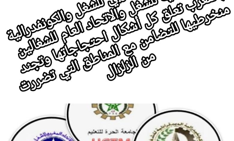 نقابات الاتحاد المغربي للشغل والكونفدرالية الديمقراطية للشغل والاتحاد العام للشغالين بالمغرب تعلق كل أشكال احتجاجاتها وتجند منخرطيها للتضامن مع المناطق التي تضررت من الزلزال