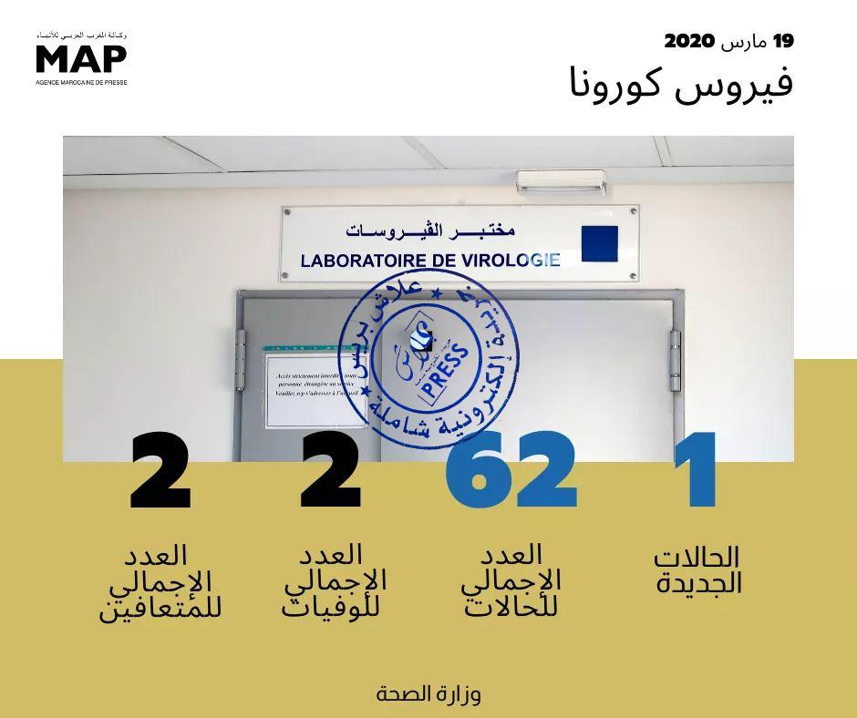 كشفت وزارة الصحة مساء اليوم الخميس، عن ارتفاع حصيلة المصابين بفيروس كورنا المستجد إلى 62 حالة إصابة أثبتت التحاليل المخبرية والطبية حملها للفيروس.