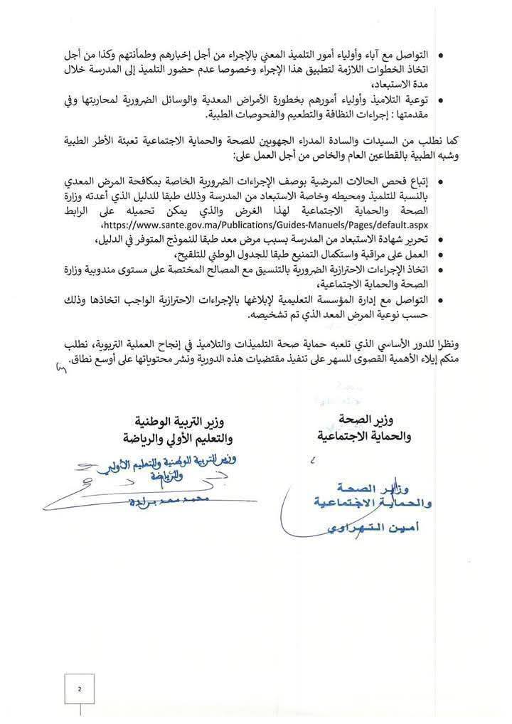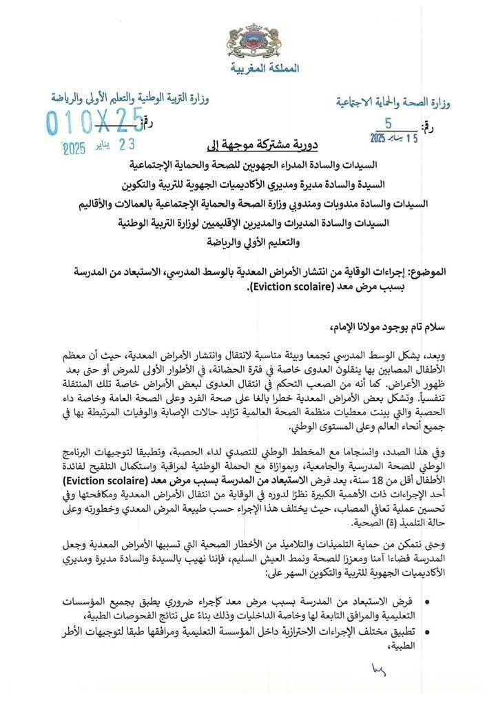 اصدرت وزارتي الصحة والحماية الاجتماعية ووزارة التربية الوطنية والتعليم الاولي والرياضة، دورية مشتركة حول إجراءات الوقاية من إنتشار الأمراض المعدية بالوسط المدرسي، والإستبعاد من المدرسة بسبب مرض معد.