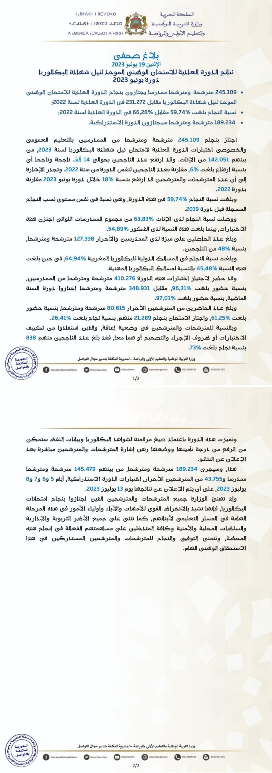 ٪59.74 في المائة هي نسبة النجاح في البكالوريا 2023 بالمغرب و189.234 مترشحة ومترشحا سيجتازون الدورة الاستدراكية.