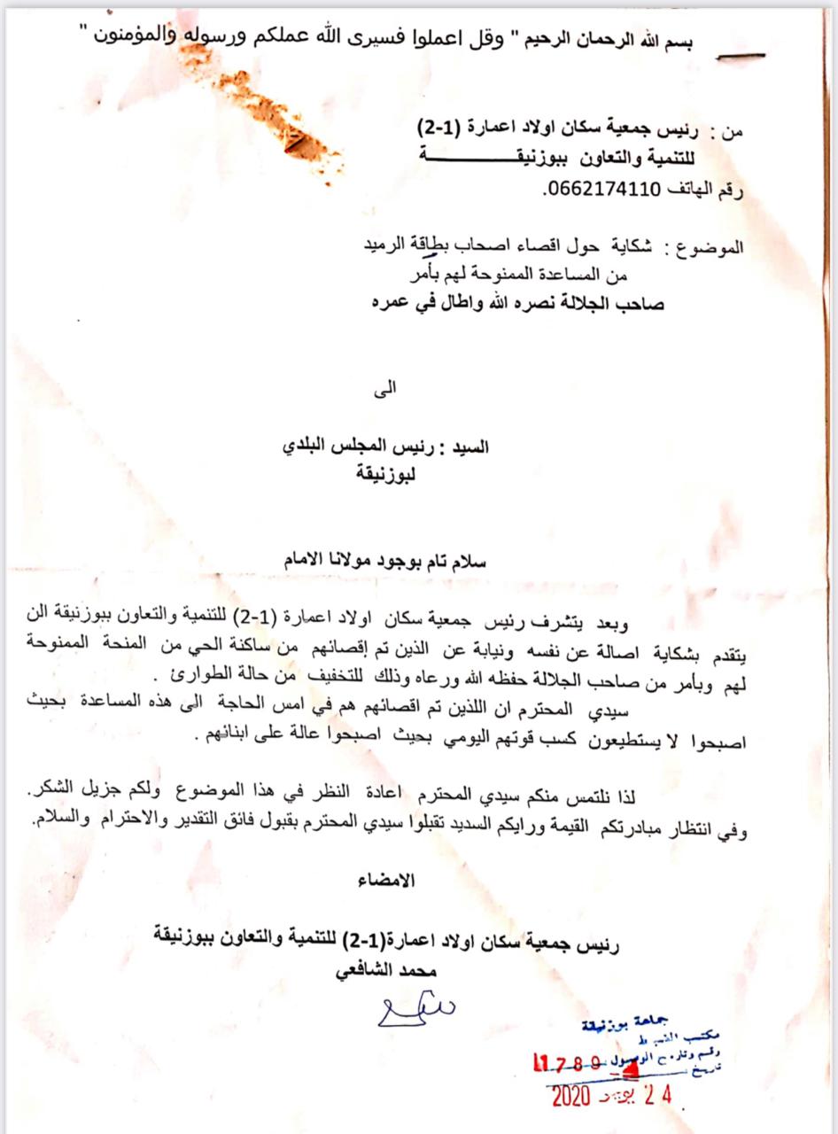 الحقيقة الغائبة هي ان رئيس جمعية اولاد عمارة،الذي يجب ان تتوفر فيه الشجاعة ويخرج ببيان حقيقة حول الامر، قام بارسال طلبين الى رئيس بلدية بوزنيقة في نفس اليوم، حيث بالاضافة الى الرسالة الاولى، توجه باخرى تتعلق بطلب مؤونات غذائية لفائدة السكان، انظر الوثيقة اسفله: