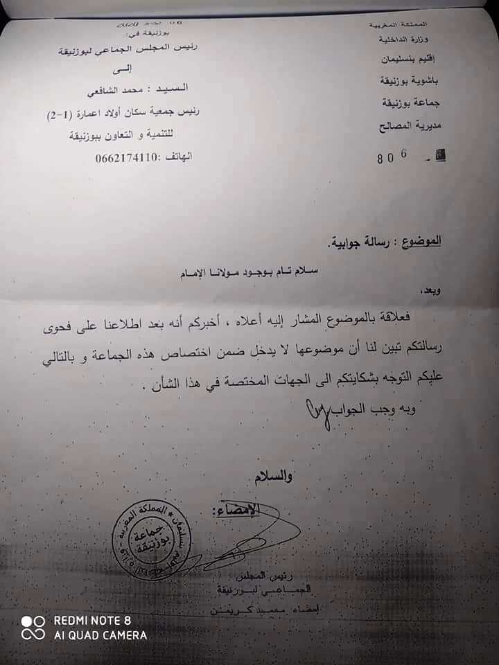 توصلت جماعة بوزنيقة على التوالي برسالتين اثنتين (2) في نفس اليوم والساعة عن طريق البريد وباشعار بالتوصل، يوم 24 يونيو 2020، تحملان رقم تسجيل (كما هو مبين اسفله)، الاولى عبارة عن #شكاية حول اقصاء أصحاب بطاقة الرميد من المساعدة الممنوحة لهم مختومة بتوقيع رئيس جمعية سكان اولاد اعمارة 1-2 وتحمل اسم محمد الشافعي؛ والثانية عبارة عن #مراسلة حول تسوية الوضعية القانونية لتجزئة اولاد اعمارة 1-2 مختومة كذلك بتوقيع رئيس جمعية اولاد اعمارة 1-2 دون الاشارة لاسمه؛ هذا وقام السيد الرئيس بتقديم جواب حول #الشكاية الاولى المتعلقة بالمساعدات الغدائية حيث تضمن جواب السيد الرئيس الموجه للسيد محمد الشافعي رئيس الجمعية (اشارة لاسمه وصفته حسب ختم الشكاية) ان موضوع الشكاية لا يدخل ضمن اختصاص الجماعة وبالتالي عليهم التوجه بشكايتهم للجهات المختصة.