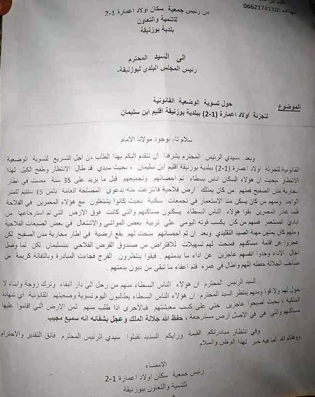 مناسبة الكلام، الهجمة اللاخلاقية التي قام بها انصار البرلماني المعلوم، الذين نشروا امس السبت وثيقتين، الاولى عبارة عن طلب من جمعية سكان اولاد اعمارة 1 و2، الى رئيس جماعة بوزنيقة يطلبون فيها الاسراع من وتيرة الإجراءات التي كان قد وعد بها السكان والممثلة في المساهمة من اجل تسليم شهادة الملكية. وهذه نسخة منها.