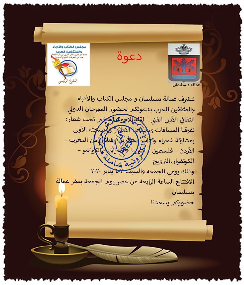 تحتضن مدينة بن سليمان على مدي يومين من بحر هذا الأسبوع مهرجان الأخوة العرب في نسخته الأولى والمنظم من قبل عمالة بنسليمان بشراكة مع مجلس الكتاب والأدباء والمثقفين العرب – هذا المهرجان الدولي الأدبي الثقافي ينظم تحت شعار الاخوه ” تفرقنا المسافات ويجمعنا الأمل “.